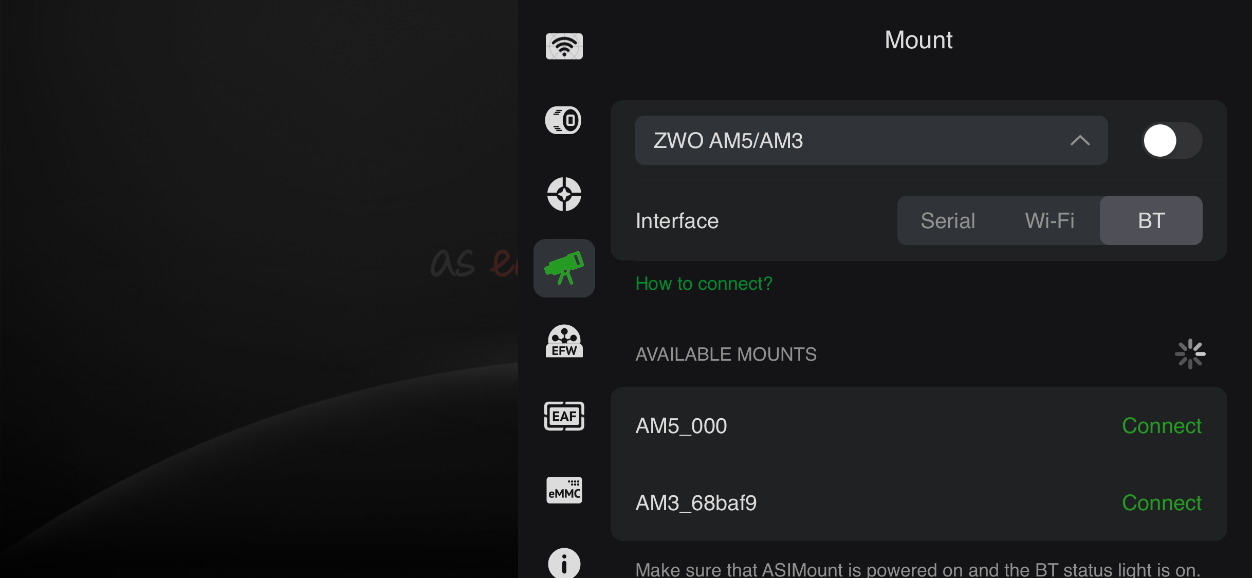 Supported controlling ASIMount via BLE (supported models: AM3, AM5N)
